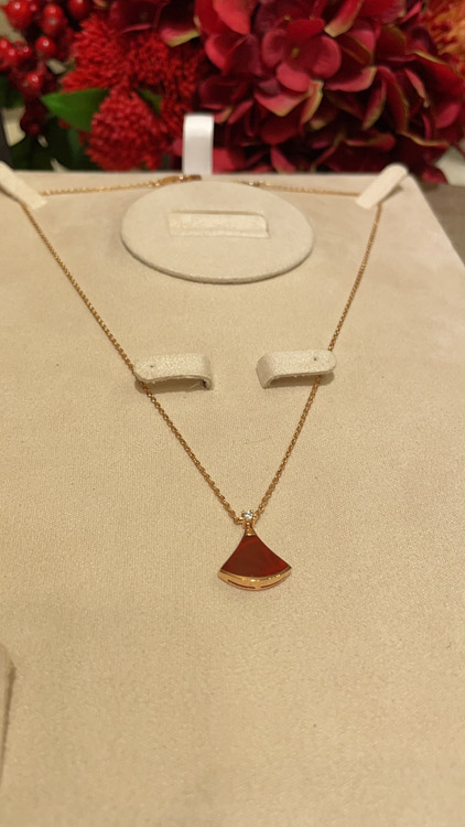 Bulgari small fan diamond red agate rose gold necklace-3894