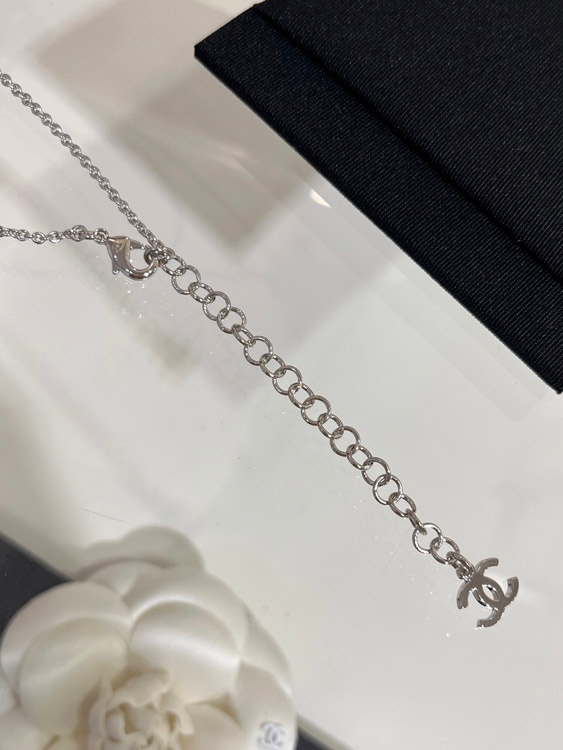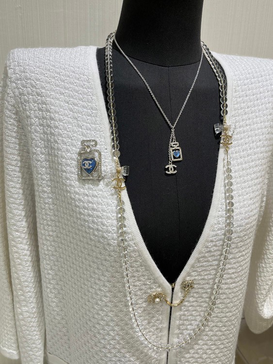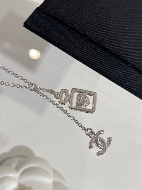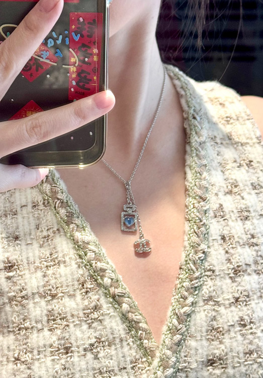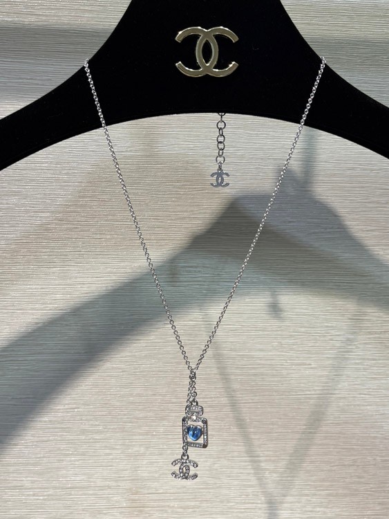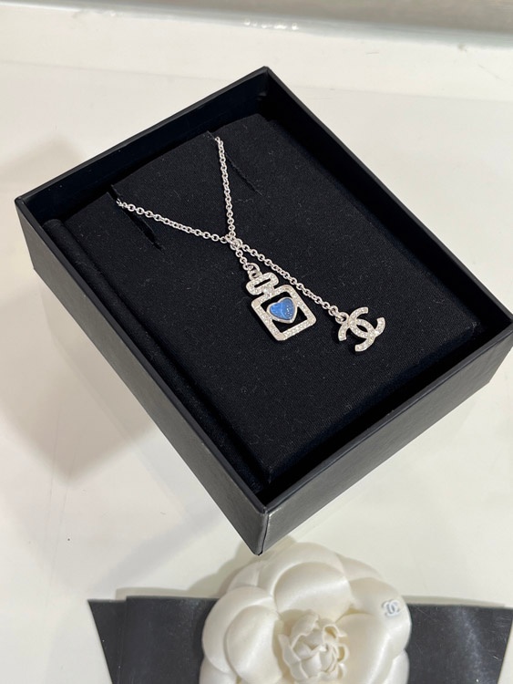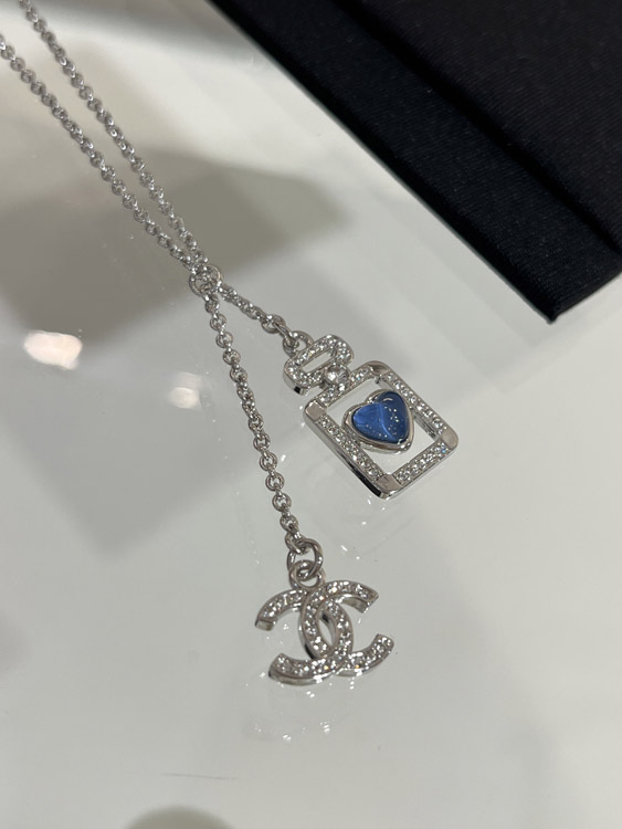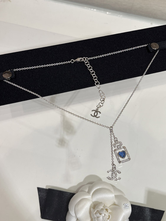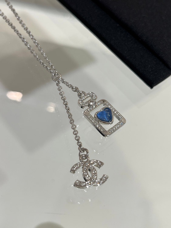Home > Chanel blue heart silver full diamond double C perfume bottle necklace-3750